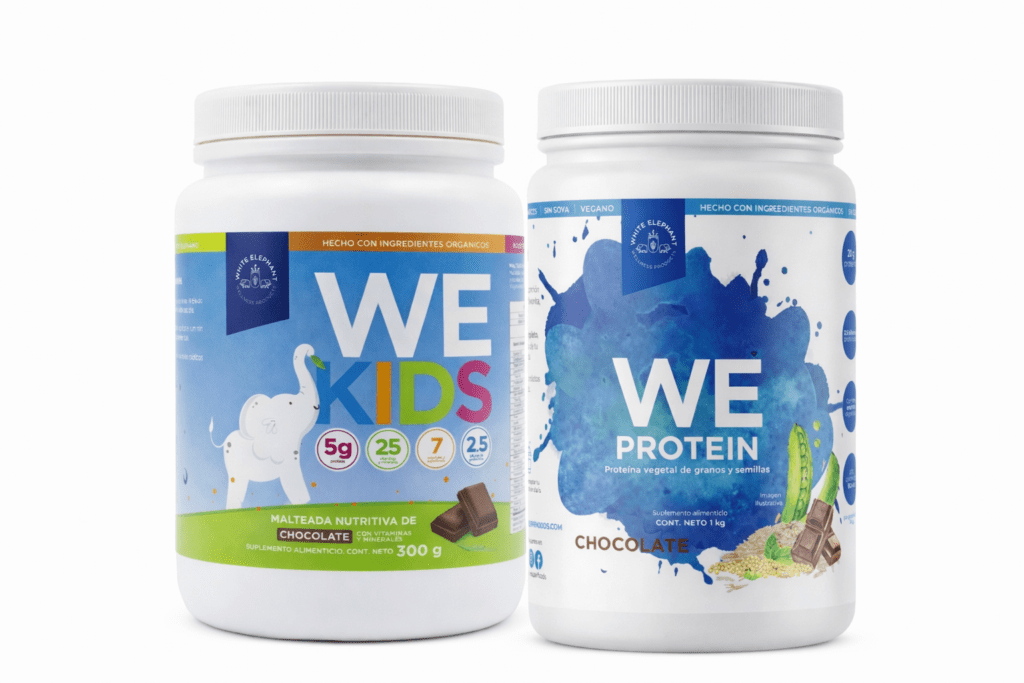 Incluye WEkids Chocolate (300g) con 5g de proteína, 25 vitaminas y minerales, y WEprotein Chocolate (1kg) proteína vegetal de granos y semillas para adultos.